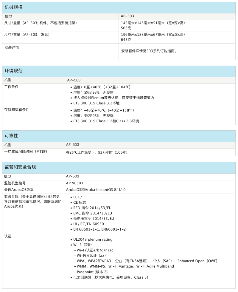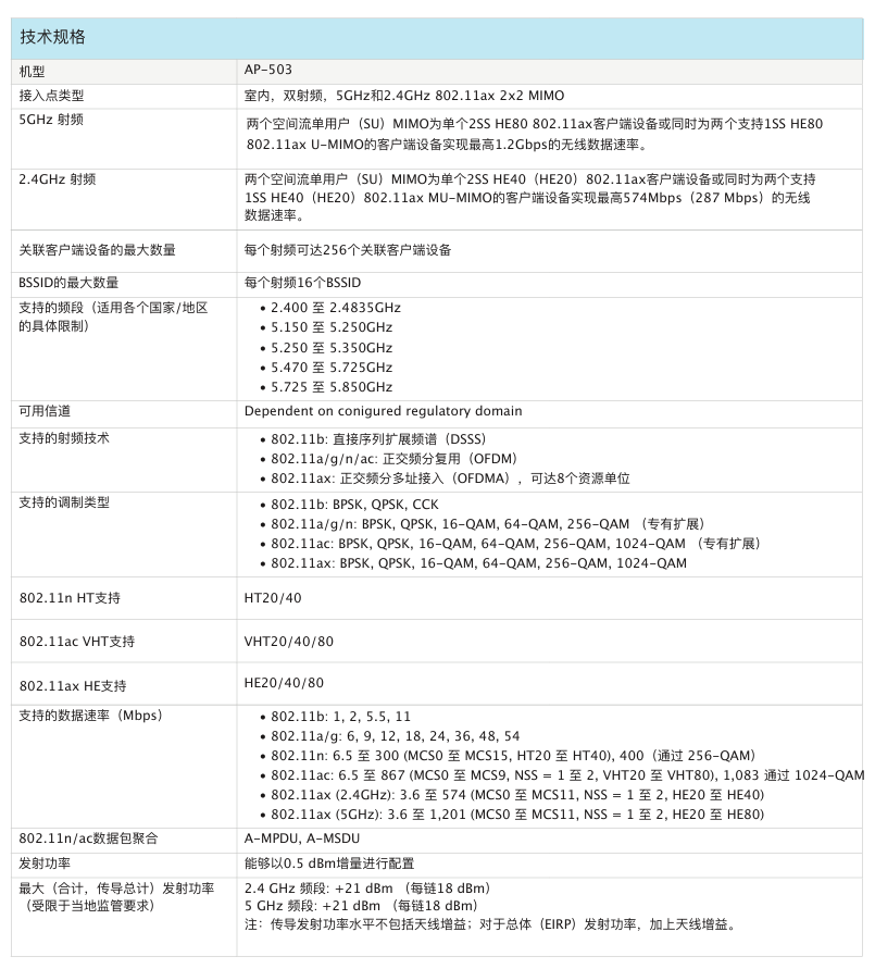 室內(nèi)中密度Wi-Fi 6接入點(diǎn)AP-503提供兼具高成本效益與高性能的連接,可以幫助各類組織應(yīng)對因移動使用需求提高、轉(zhuǎn)向云或物聯(lián)網(wǎng)環(huán)境而帶來的設(shè)備增長挑戰(zhàn)。503 系列的實(shí)際聚合數(shù)據(jù)速率高達(dá) 1.775 Gbps(HE80/HE40),可以為學(xué)校、中型辦公室和零售賣場等中等密度的場地和工作場所提供所需的連接速度和可靠性。